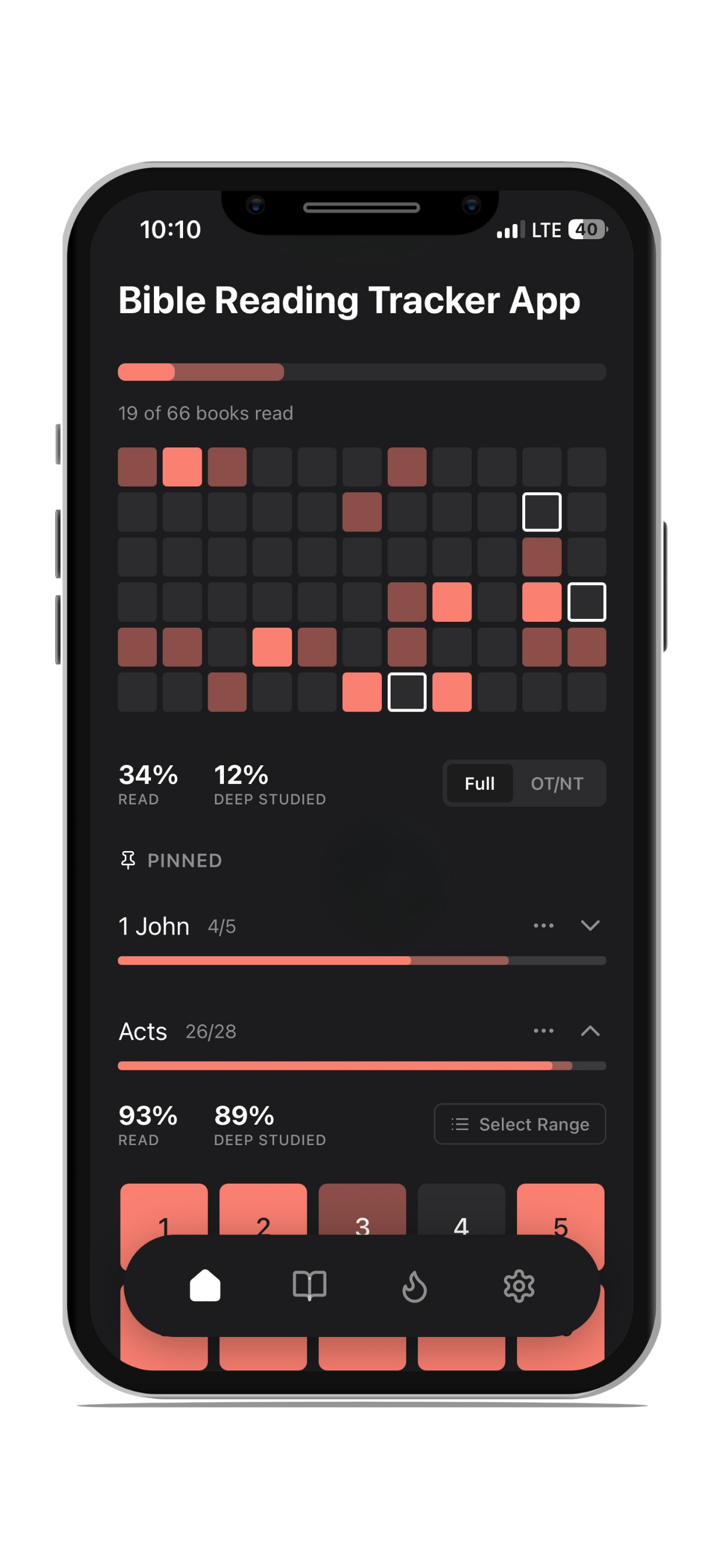 Visual Progress Dashboard — See your entire Bible journey on a beautiful grid showing all 66 books